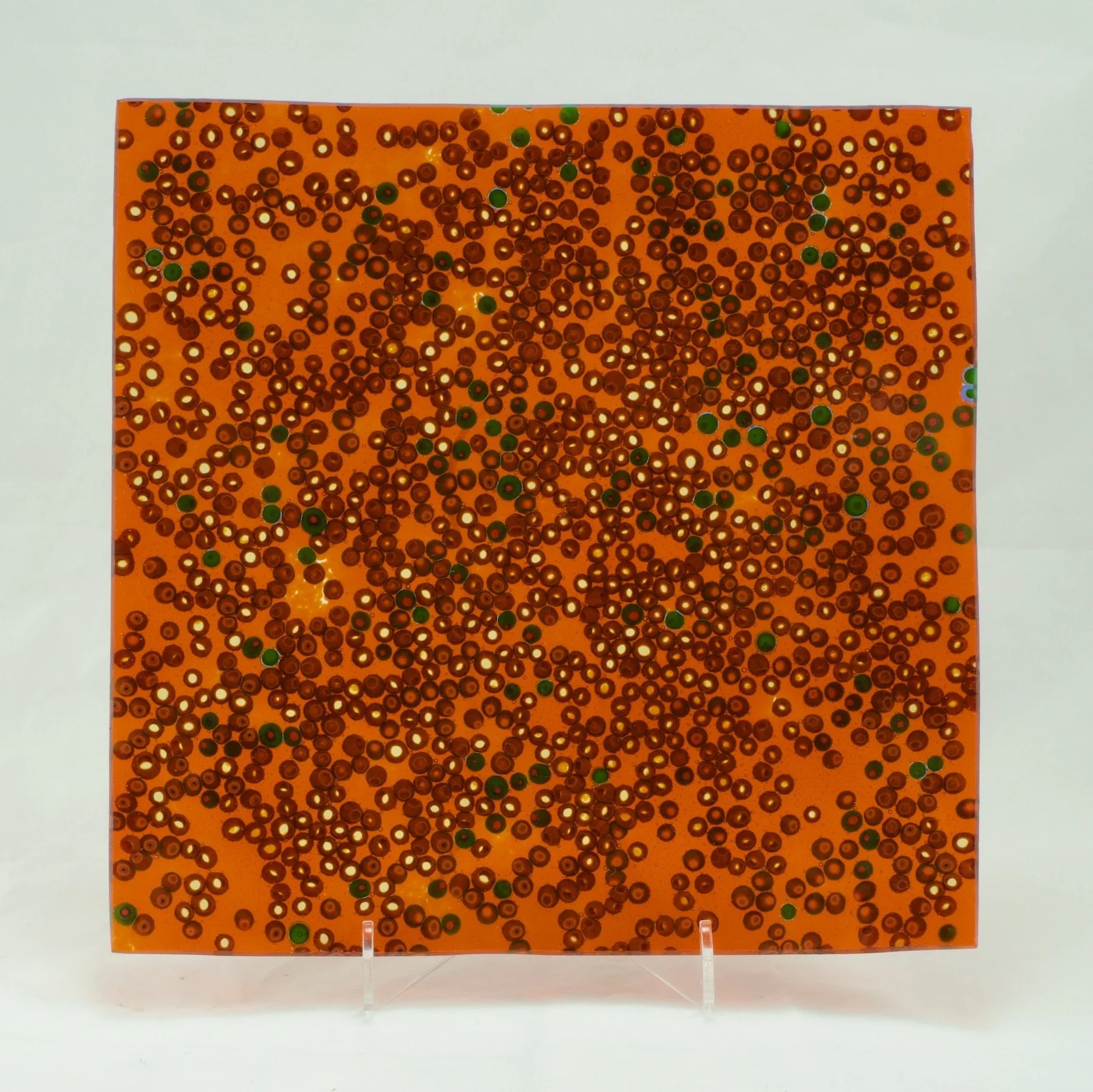 This bowl and platter are made from the same vibrant hues using different techniques from the same batch of murrine. In both pieces you see an array of concentric circles of color.